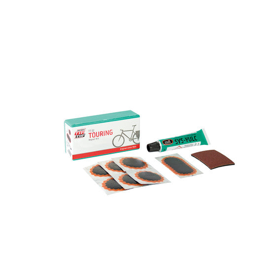 Dieses Flickzeug ist deine mobile Pannenhilfe für unterwegs. Es enthält sechs Flicken für Schläuche, einen Reifenflicken, 5g SVS-Vulkanisierung und Schleifpapier, um die Oberfläche aufzurauen.